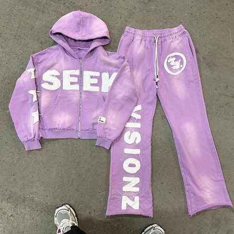 カスタマイズコットンフレアスウェットパンツパーカーセット2ピース刺繍アップリケパッチストリート特大アシッドウォッシュスウェットスーツ大人用